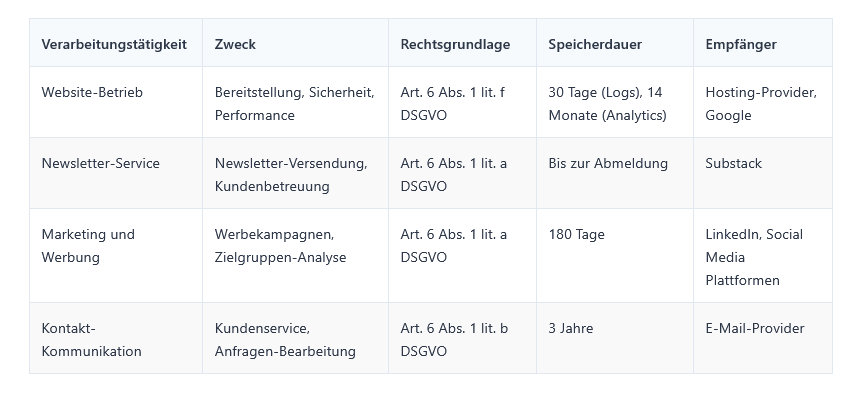 Unsere Verantwortung: Wir verarbeiten keine Blockchain-Transaktionsdaten direkt und haben keinen Einfluss auf die Datenschutz-Eigenschaften von Blockchain-Netzwerken.